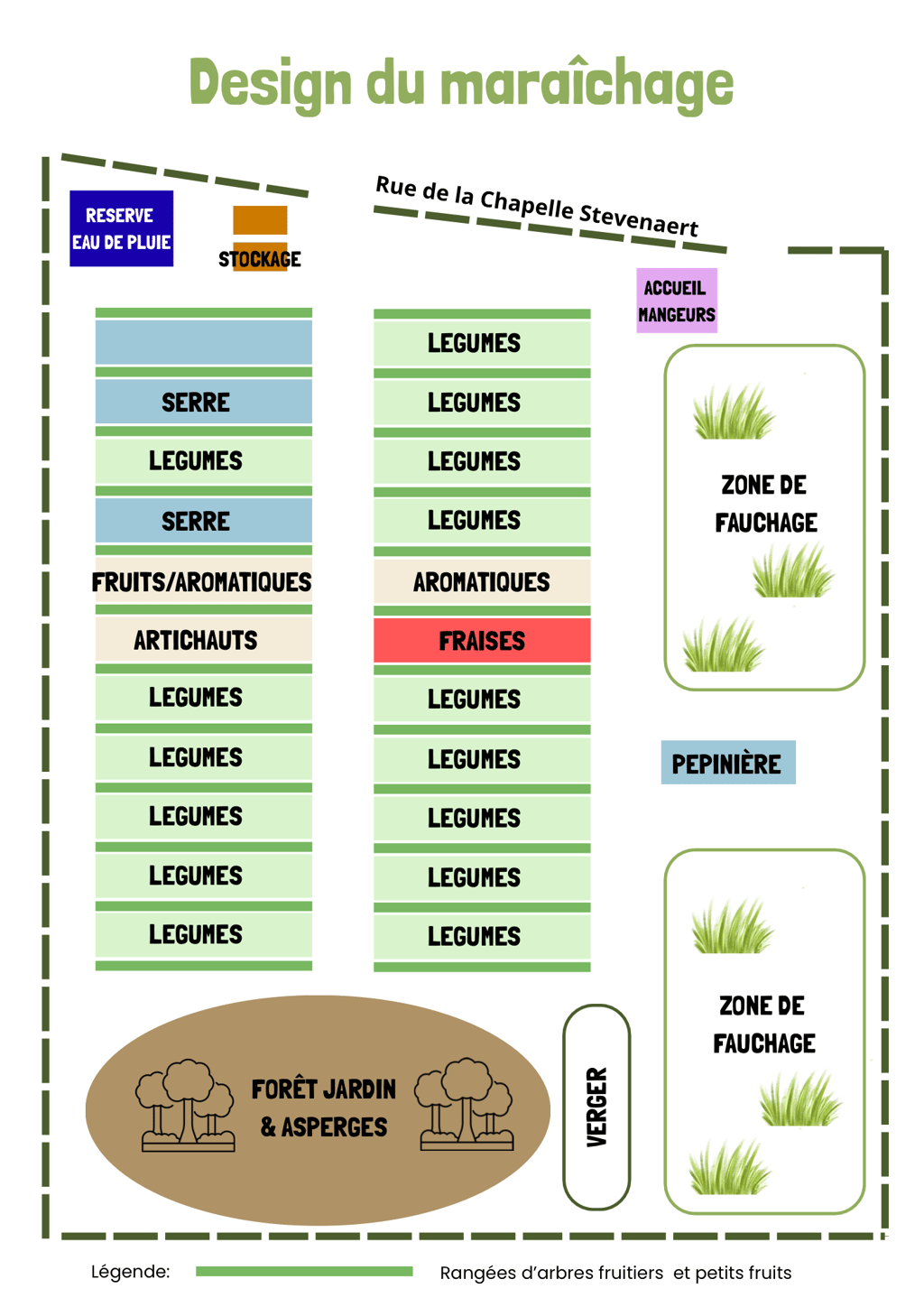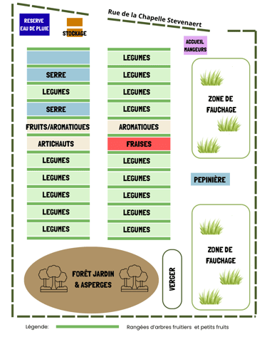Un aspect important de ce terrain, c’est sa topographie. En effet, le terrain a un dénivelé très important, de l’ordre de 12 m. C'est cette caractéristique qui fait tout son charme au lieu mais qui constitue tout de même un challenge pour la production agricole. En tenant compte de cette topographie spécifique, le design du terrain a donc été imaginé sur les principes de l'agroforesterie et de la permaculture. Les jardins maraîchers sont ainsi entrecoupés de lignes de fruitiers, plantées selon les courbes de niveau pour permettre de limiter l'érosion due à la pente. Les serres seront installées sur la partie haute du terrain qui bénéficie d'une surface au sol plus plane et, sur les zones plus pentue, nous mettrons en place des cultures pérennes (aromatiques, artichauts, autres petits fruits, ...) qui viendront renforcer l'effet bénéfique des arbres contre l'érosion.