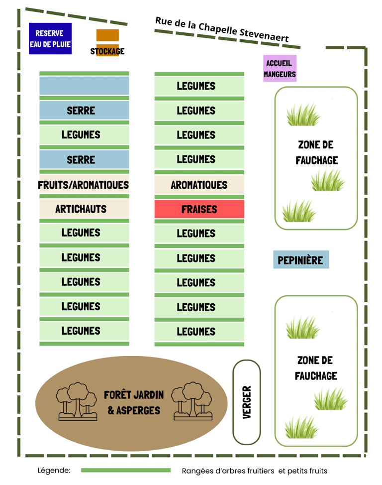 Le projet prend place sur un magnifique terrain situé à Jodoigne Souveraine, le long de la Chapelle Stevenaert et bordé par une haie triple rang diversifiée. Il a une superficie totale de 1ha8 dont nous cultivons environ un hectare pour la production de fruits et légumes. Le reste des parcelles constitue pour le moment des zones de fauchage ainsi qu'un petit bosquet animé par le chant de nombreux oiseaux.